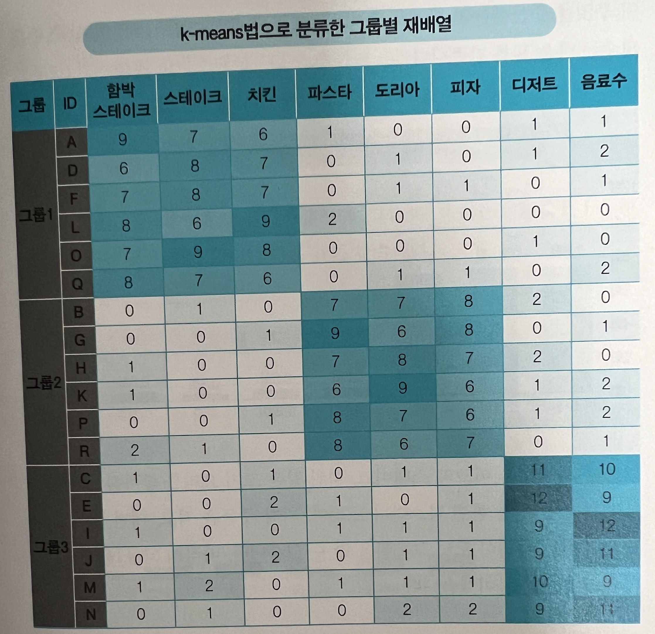 각 그룹이 좋아하는 음식에 관련된 쿠폰을 지급하는 것이 홍보 효과를 좀 더 극대화 하는 방법일 것이다. 이처럼 데이터를 그룹핑 함으로써 후속 대책에 대해서 좀 더 효율적으로 세울 수 있다.