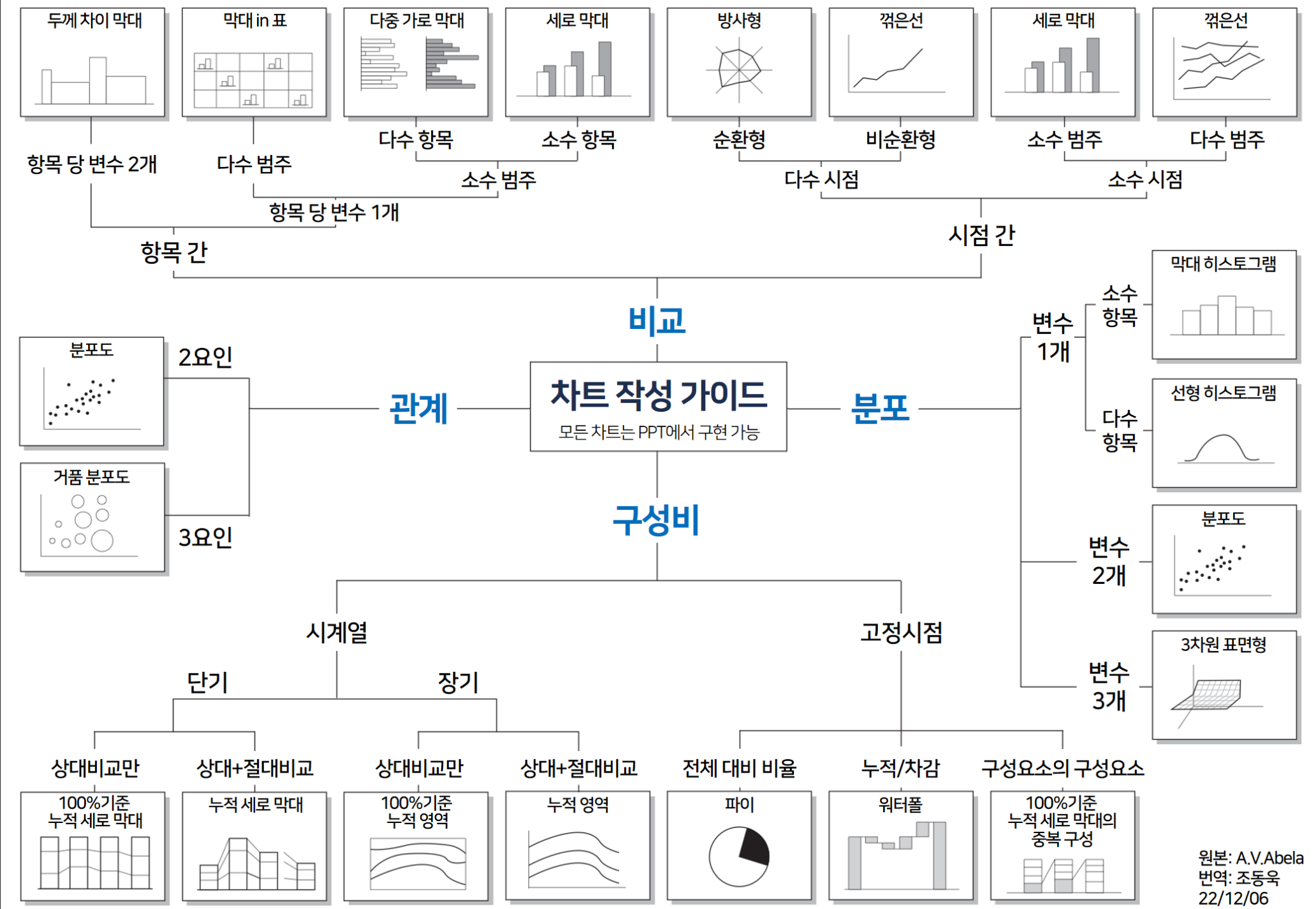 어떤 차트를 선택할 지는 정답이 없다. 데이터에서 발견한 의미를 적절하고 명확히 전달할 수 있는 시각화 방식이 필요할 뿐이다. 위 그림은 크게 4가지 Factor 로 구분하여 차트를 제안하고 있다. 오래된 자료이기도 하고 시각화 또한 트랜드도 많이 변했고 샘플 또한 다양해졌다.