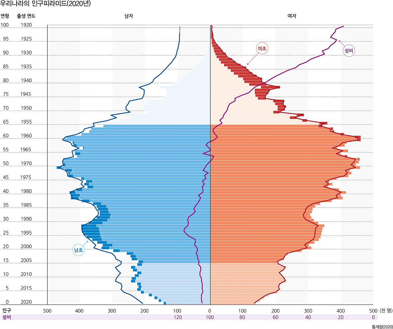 2020년 대한민국 인구 피라미드이다. 경제활동이 가능한 20~60세까지 전체인구의 중심을 이루고 있으나, 최근에는 젊은층이 좀 더 얇아졌다. 좀 더 상세한 데이터는 통계청 사이트에 가면 많은 정보를 확인할 수 있다. (Open-api 로도 제공한다)