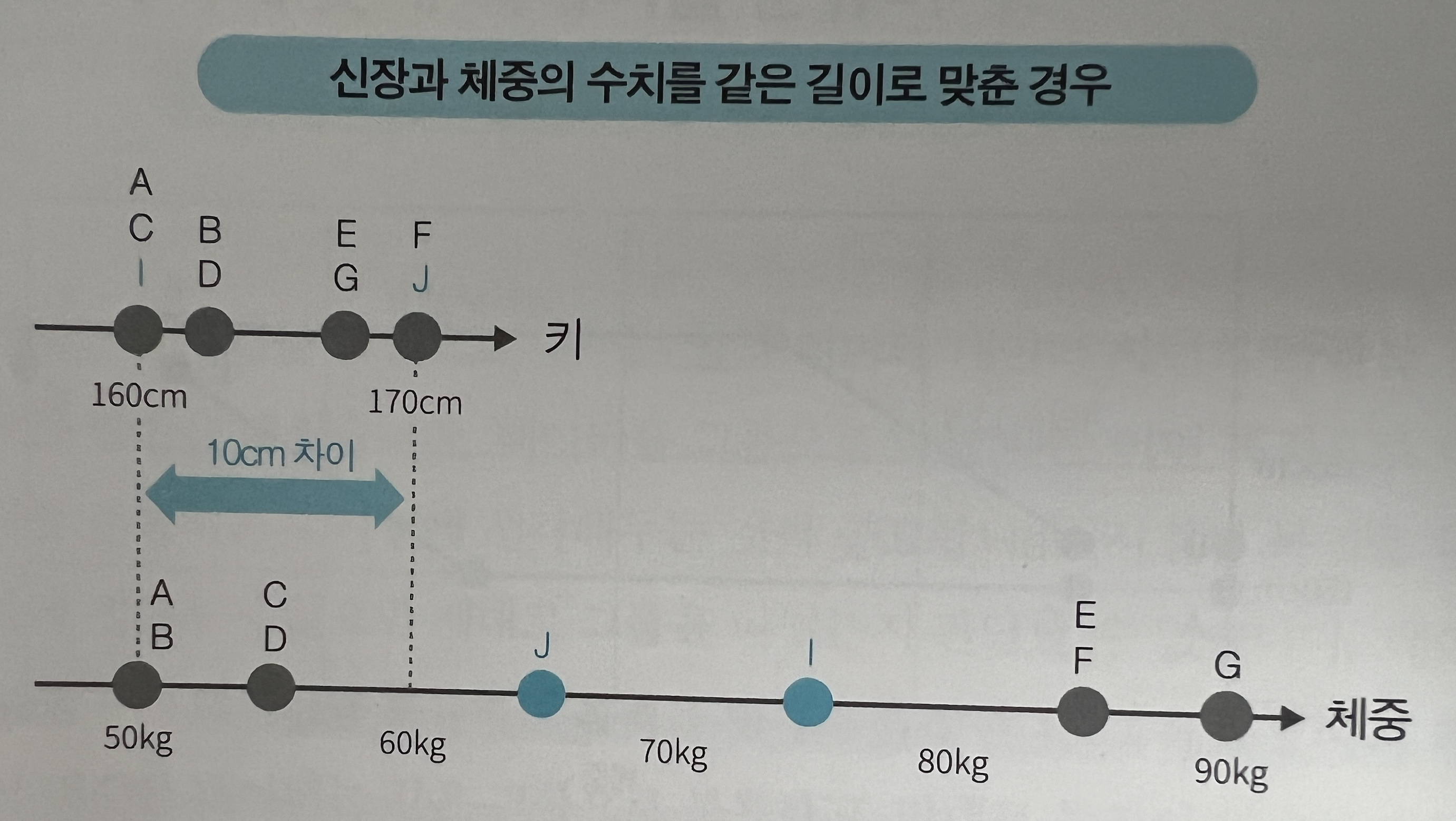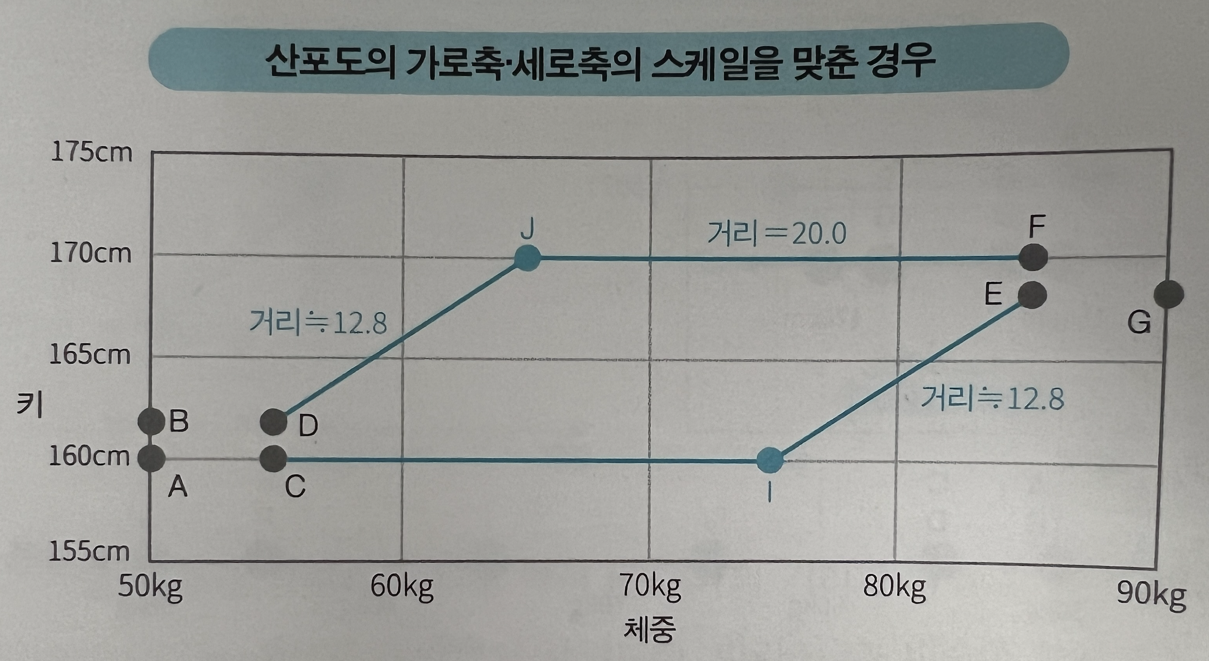 (A, D, F), (C, E, I), (B, G, H) 각 그룹 사이에는 가까운 것을 확인할 수 있다. 2차원에서 데이터 사이의 거리는 두 점의 거리로 생각할 수 있으며, 이는 (수학시간에 배운) 피타고라서 정리 공식으로 계산해 볼 수 있다. Scale이 다른 경우는 어떠한가? 키와 몸무게를 비교한 경우는 단순히 데이터 간의 거리로 비교하기는 어렵다. 이때 활용할 수 있는 것이 데이터 표준화(평균값을 0, 분산을 1로 만드는 처리)를 하여 Scale을 맞춰주는 작업을 한 뒤 비교한다.