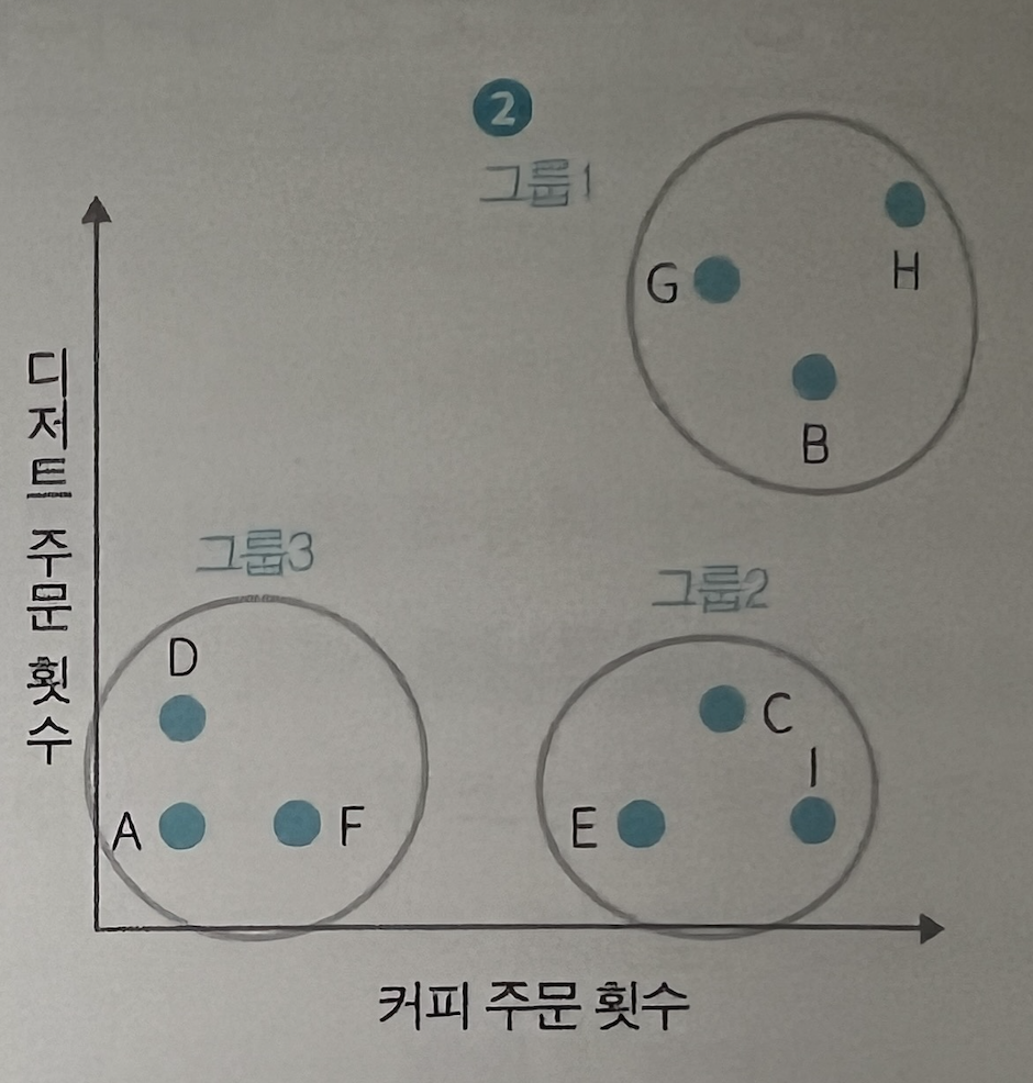 어느 카페에서 커피와 디저트 주문 횟수를 시각화 한 사례이다. 대략 손님을 그룹핑하면 우측 그림처럼 될 것이다. (책에는 3가지 선택지를 가진 퀴즈로 소개하는데, 간단한 부분이라 생략하고 정답만 소개한다) 그룹1, 2, 3으로 나눠진 기준은 무엇일까?