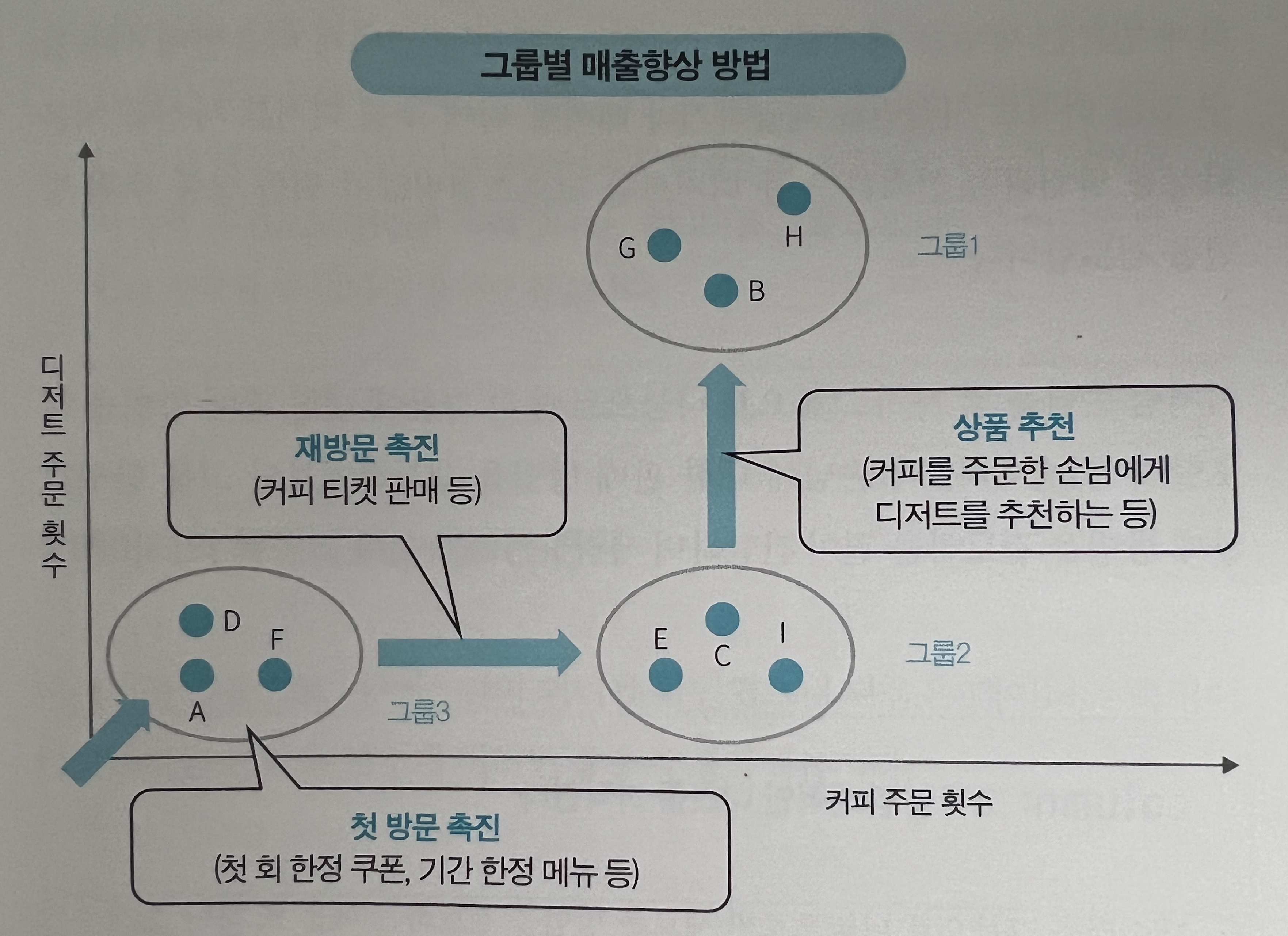 다시 카페 손님을 구분한 사례로 돌아와 보자. 3그룹으로 나눴고, 어떤 특징이 있는지도 살펴 보았다. 모든 카페의 목적은 돈을 버는 것이기에 매출 증대를 위해서는 어떤 방법이 있을까? 모든 손님이 그룹1의 특징을 보여준다면 제일 좋을 것이다. 하지만 그룹3의 손님들이 갑자기 그룹1 손님의 특징을 보일 순 없다. 그룹 3 -> 2 -> 1 순서로 유도가 필요하다.