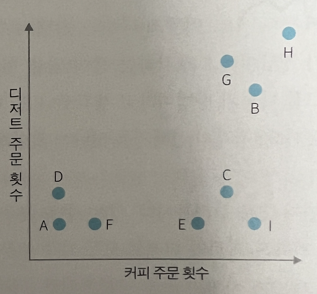 특징이 비슷한 고객군을 분리하는 것이 분석에 용이하다는 것을 확인할 수 있는데, 그럼 특징이 비슷하다는 판단은 어떻게 하는 것일까? 데이터 사이의 거리를 계산해 볼 수 있다. 카페의 사례로 다시 돌아가 보자.