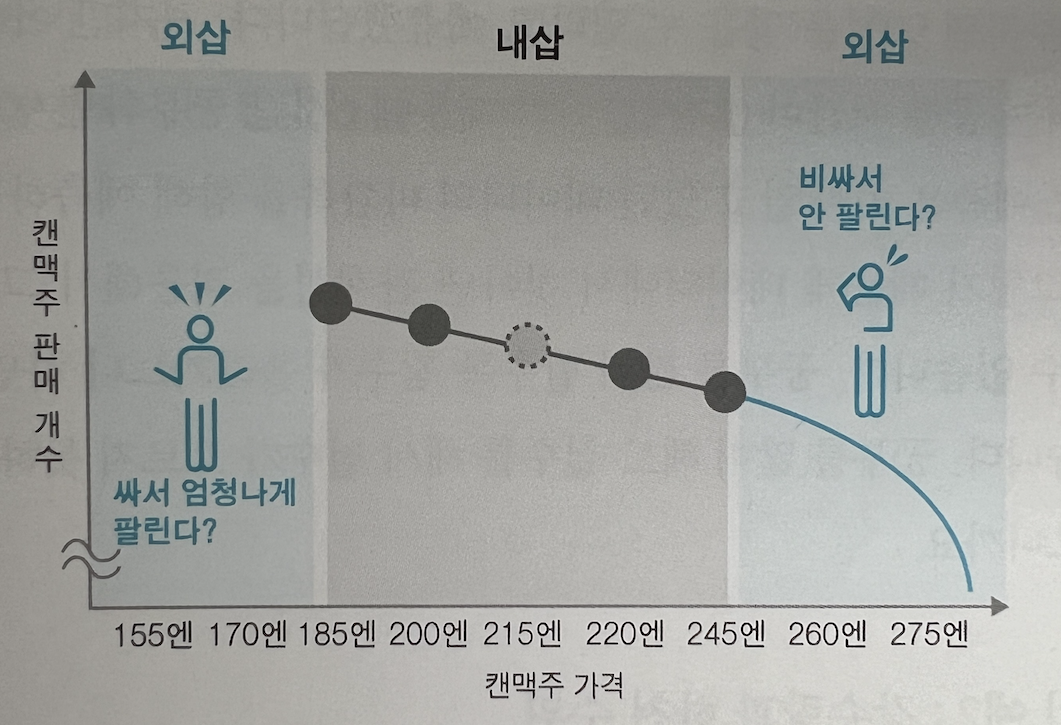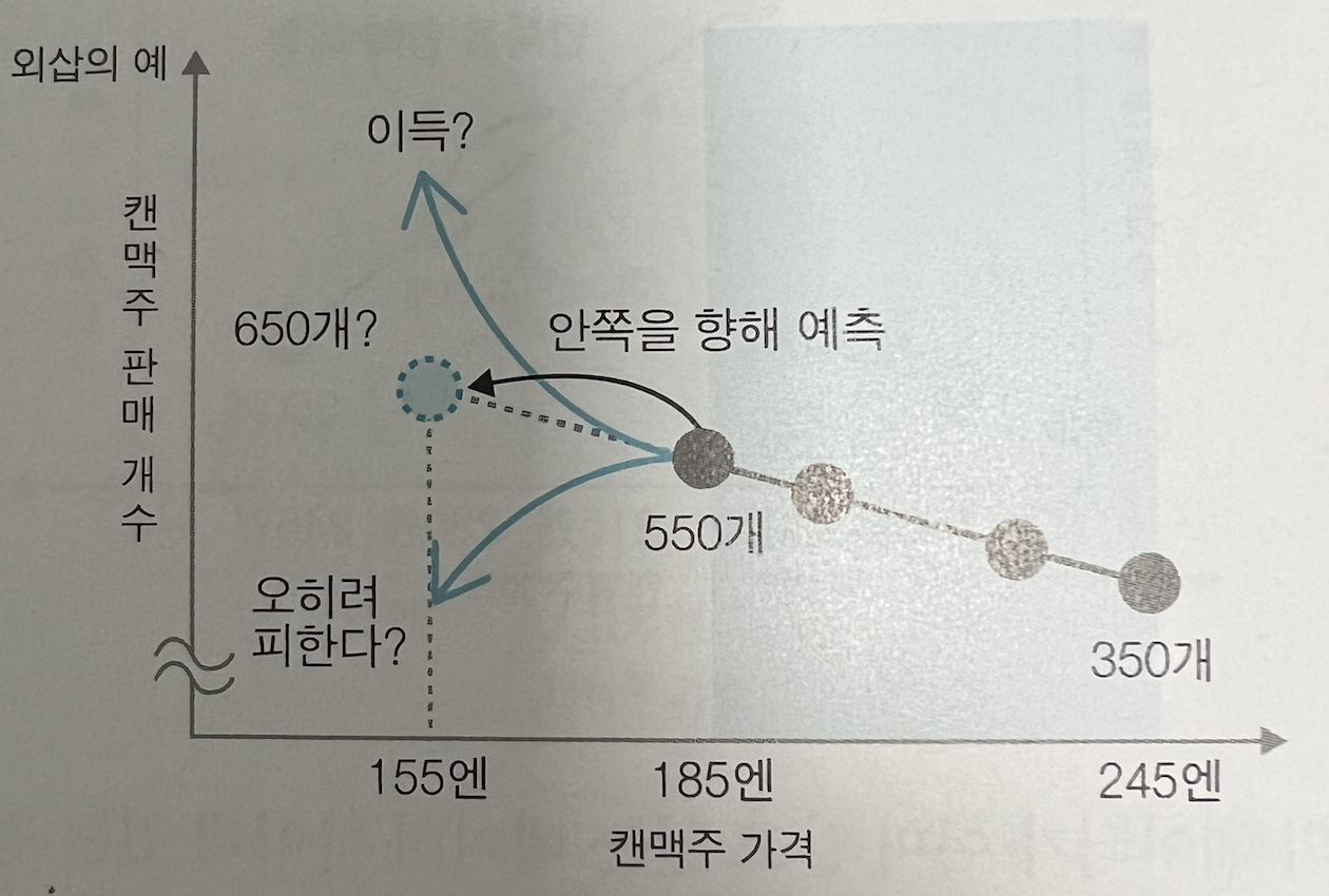 캔 맥주를 155엔에 팔았을 때 얼마나 팔렸을 지 예측할 수 있는가? 주어진 데이터를 기반으로 650개로 예측을 해 볼 수도 있겠으나 사실은 알 수 없다. 낮아진 가격만큼 사재기를 위해 엄청 판매될 수 있고, 오히려 너무 싸다고 판단되어 판매가 위축될 수도 있다. 이처럼 주어진 데이터 범위 밖에 데이터를 외삽이라고 한다. (당연히 범위 안은 내삽)
