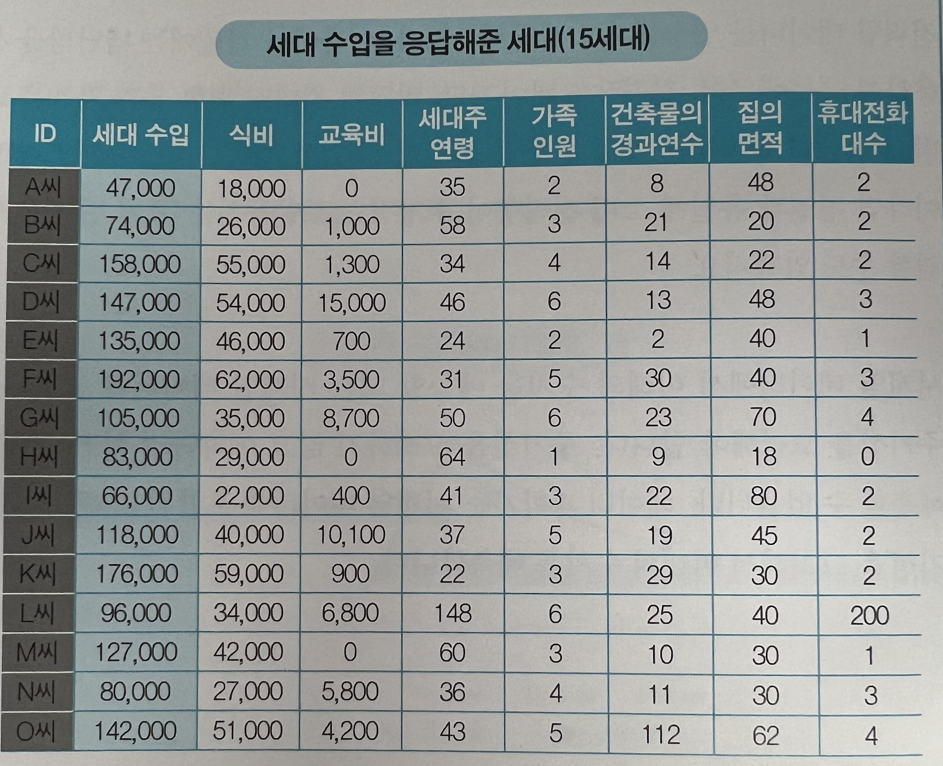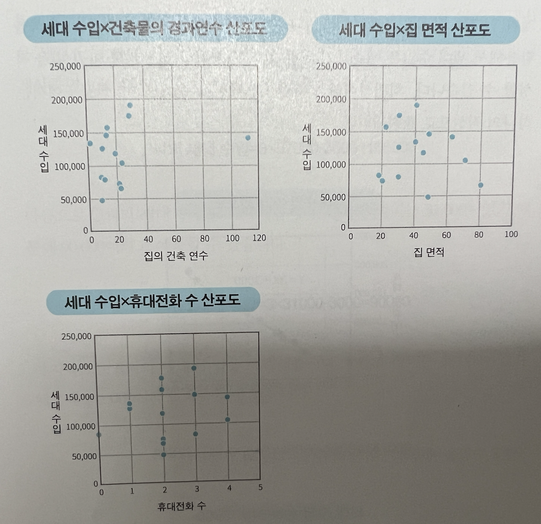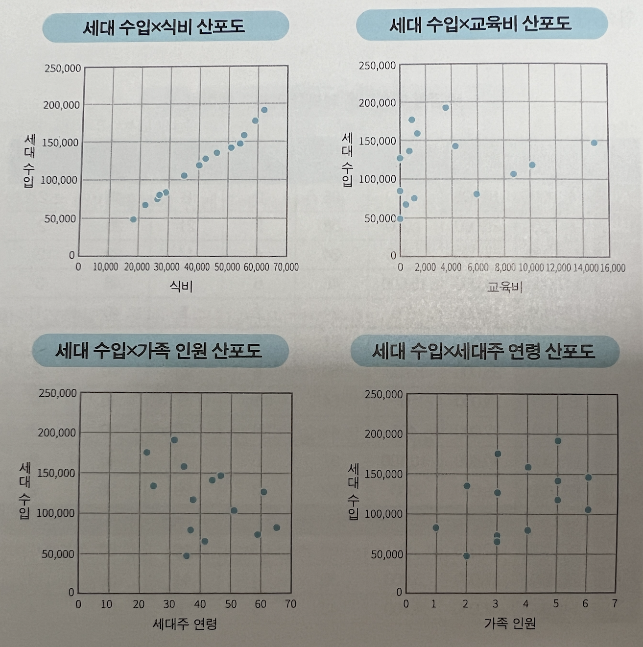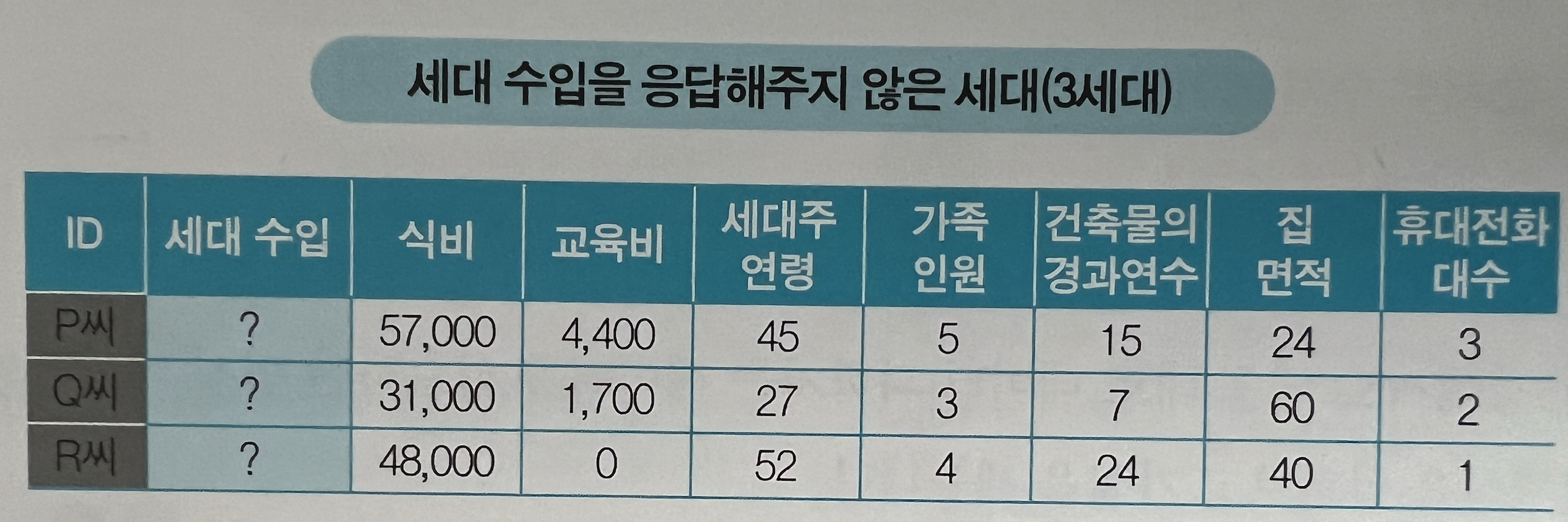 식비가 가장 양의 상관관계를 보여주고 있다. 계산을 해 보진 않았지만 (책에서는 0.99라고 한다) 거의 선형적으로 증가함을 볼 수 있다. 이를 기반으로 세대 수입을 예측해 보면 될 것이다. (대략 P > R > Q 순으로 세대 수입이 예측될 것 같다.)