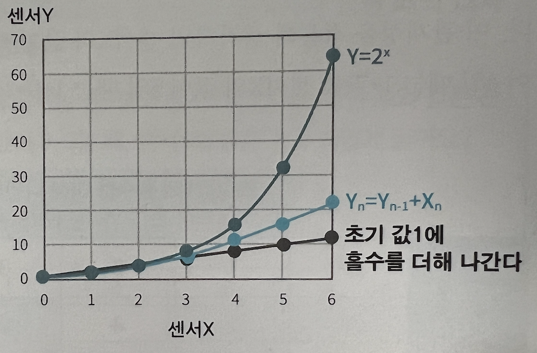 물음표에는 어떤 숫자가 들어올까? (아마도 어렵지 않을 것이다.) 정답은 9이다. 단순히 2씩 증가하는 등차수열이다. 꼭 등차/등비가 아닌 수식을 기반한 패턴을 가질 수도 있다. 이처럼 수치의 패턴을 파악할 때 앞/뒤 관계성을 잘 파악해야 한다. 하지만 주어진 데이터로부터는 관계성을 찾는 것이 어려울 수도 있다. (아래 그림 참고) 센서 X값이 0~3까지는 거의 유사하나 4부터 점점 벌어지더니 엄청난 차이를 보이고 있다. 만약 주어진 데이터가 0~3까지만 있다면? 3개 그래프 중 어떤 관계성을 갖는지 확인할 수 있을까? (어렵다.)