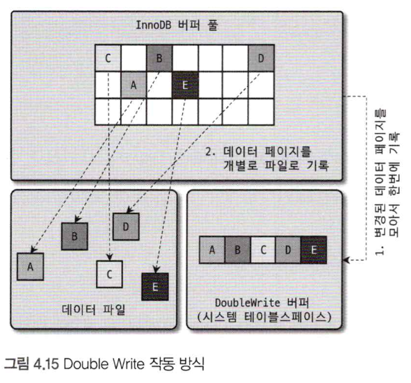 - A~E까지 Dirty Page를 우선 Double Write Buffer에 묶어서 기록